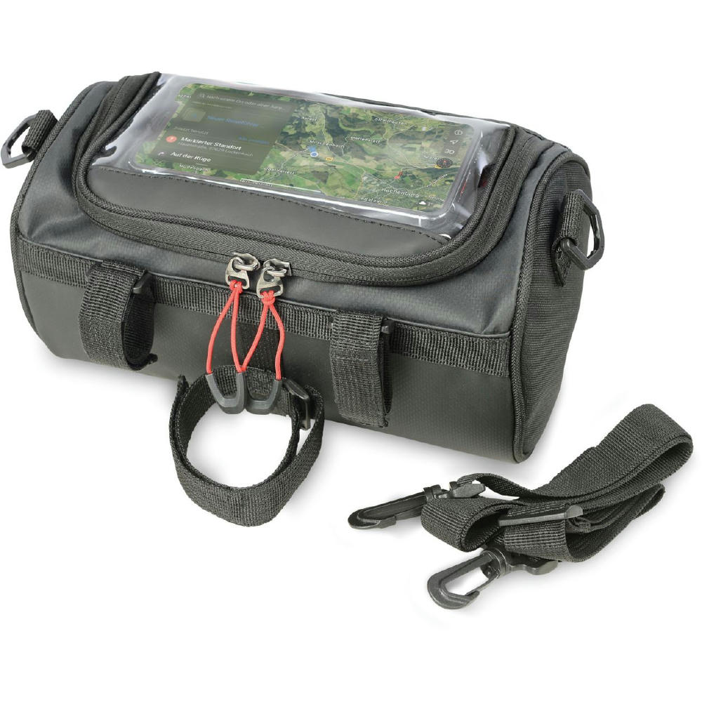 Fahrradtasche für den Lenker, flexible Befestigung mittels 3 Klettverschlussbändern am Lenker, geräumiges Hauptfach mit Reißverschluss, inkl. Netzfach (z.B.: für Powerbank), Touchscreen-Sichtfenster passend für gängige mobile Geräte zur Navigation, seitlich geöffnet zum Hauptfach (Laden via Powerbank), abnehmbarer, verstellbarer Schultergurt, Schlaufe zur Befestigung des Vorderlichts, Kapazität ca. 4 Liter, Tragkraft bis zu 5 kg, schützt Inhalt vor Spritzwasser (Wasserdichtheitsgrad IPX4) , formstabil durch verstärkte Kanten.