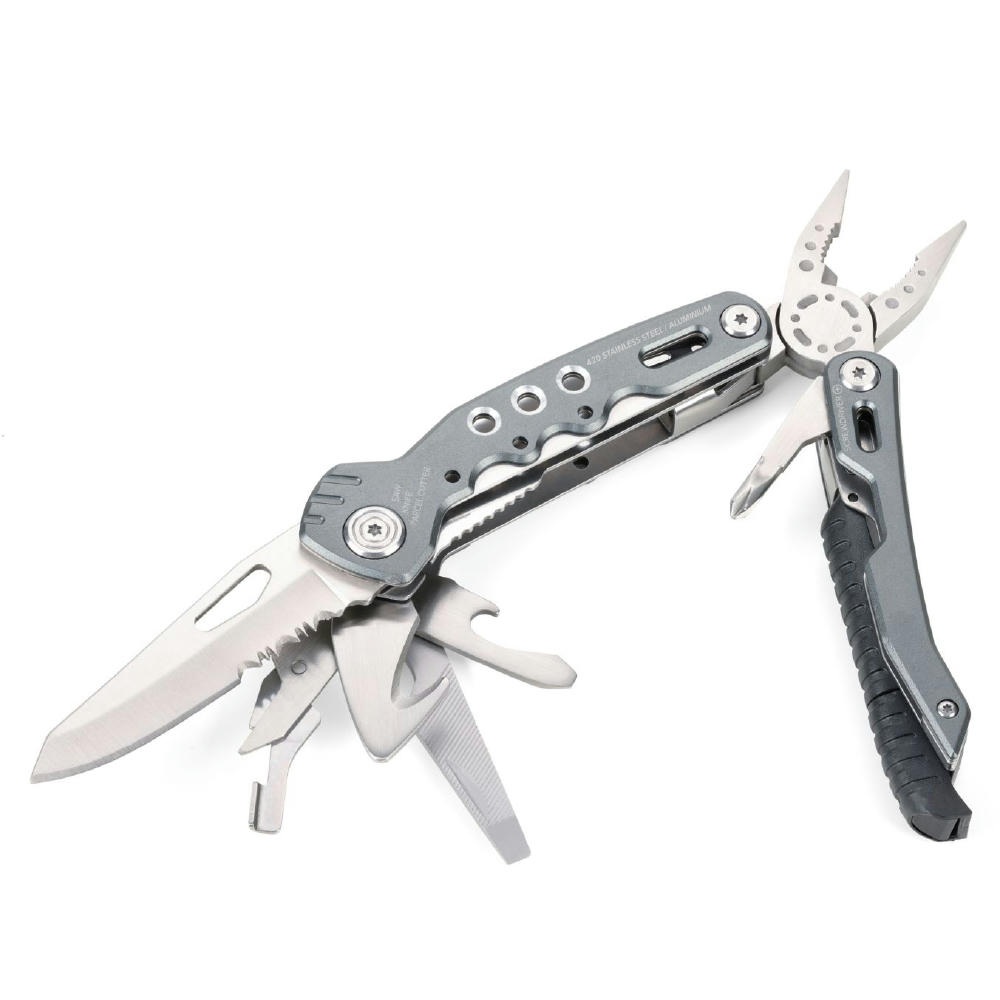 Multifunktions-Werkzeug mit 14 Funktionen, integrierte Feder und Feststellfunktion, Spitzzange, Zange, SeitenSCHNEIDER, Messer, Säge, Schere, Paketmesser, Schlitzschraubendreher in 2 Größen, Flaschenöffner, Kreuzschraubendreher, Feile, Feuerstahl, Pfeife. In Nylontasche mit Gürtelschlaufe.