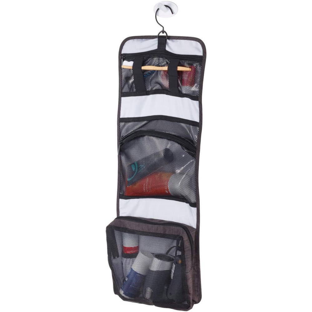 Reise-Kulturtasche mit Haken zum Aufhängen und als Schließe, Innen: atmungsaktives Netzfach mit Reißverschluss und Steckfächern, 2 Reißverschlussfächer mit Netz und PVC Beschichtung (Schutz vor Flüssigkeiten), Fronttasche mit Reißverschluss