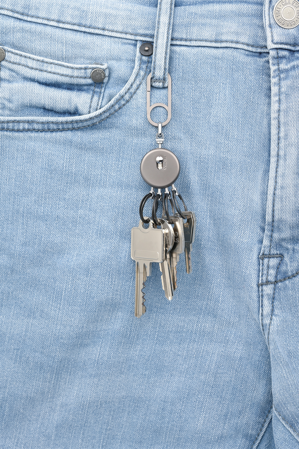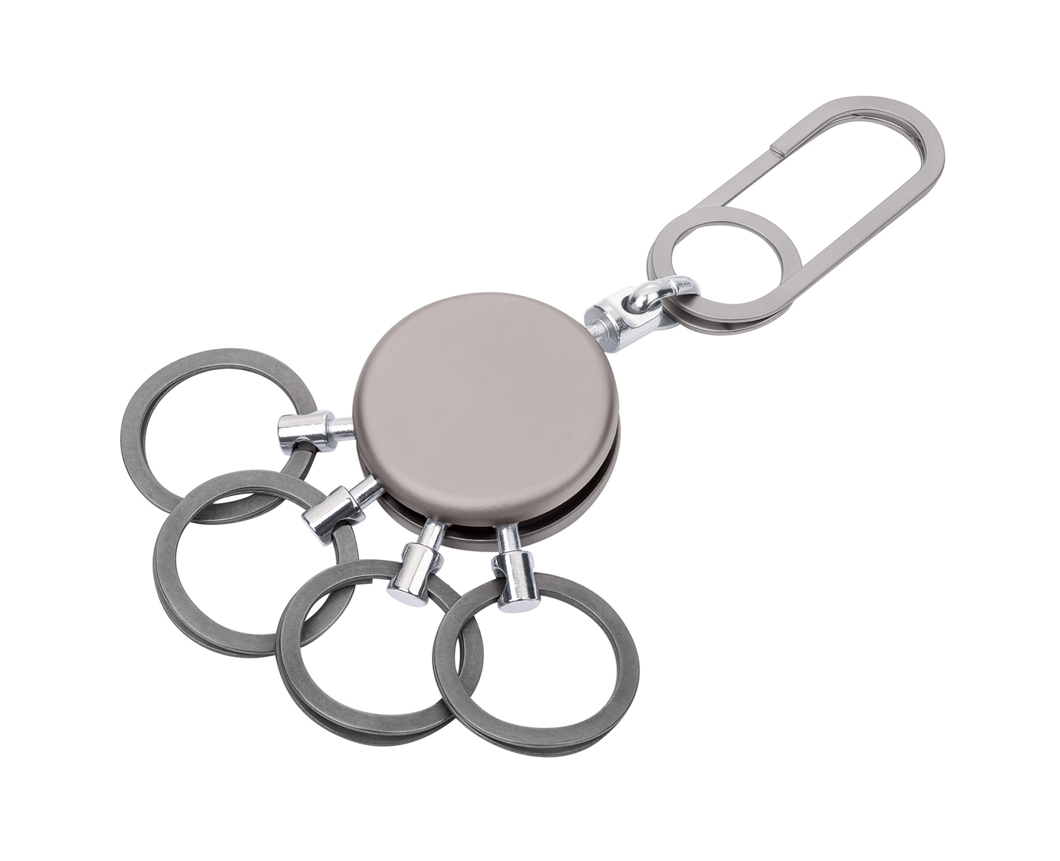 Schlüsselanhänger, rund, inkl. Karabinerhaken, 4 ausklinkbare Ringe, schnelles & einfaches Anbringen der Schlüssel dank patentiertem Öffnungsmechanismus (Nail Guard), Messing, Metall, verchromt, matt, gunmetal.