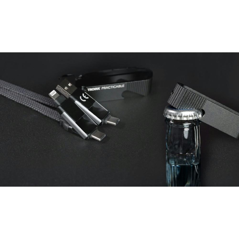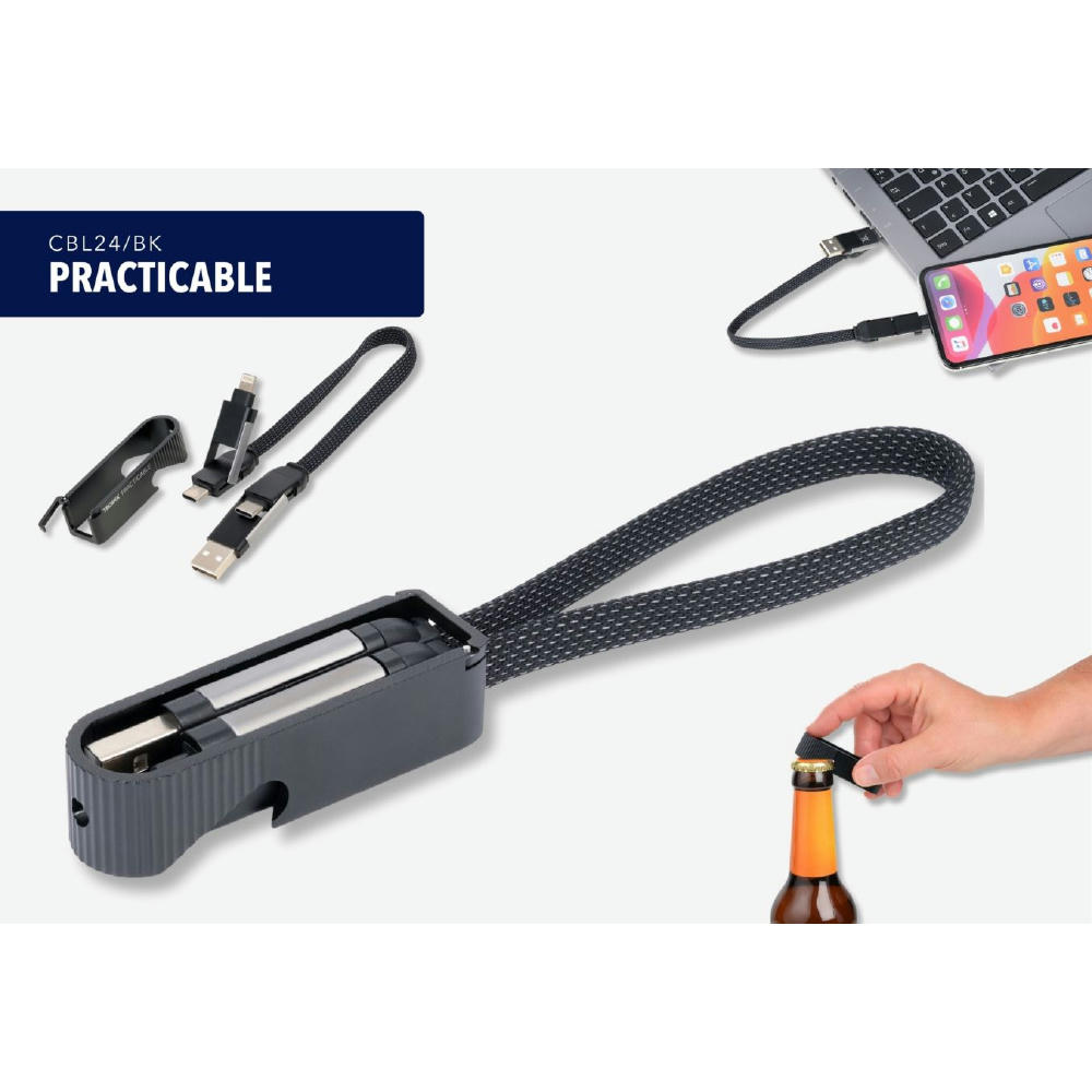 Schnellladekabel mit Flaschenöffner für unterwegs, USB/USB-C auf Lightning oder USB-C, mit Datenübertragungsfunktion, Kabel textilummantelt.