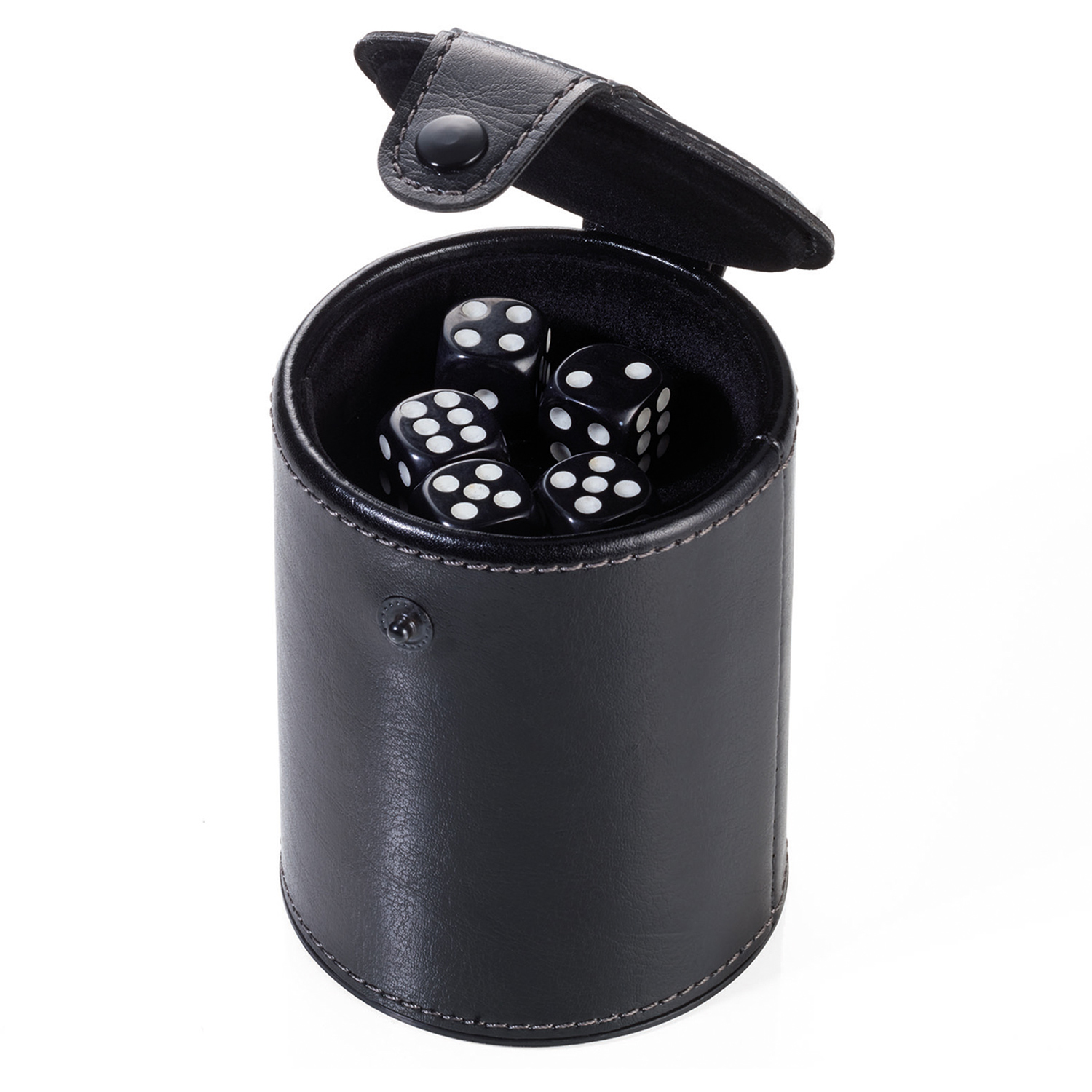Würfelbecher und Stifteköcher, mit 5 Würfeln (schwarz mit weißen Augen), Würfel verstaubar im Fach am Boden des Bechers. Material: Kunstleder, Samt. Farbe: schwarz. Maße: 8 x 8 x 10 cm, Gewicht: 122 g