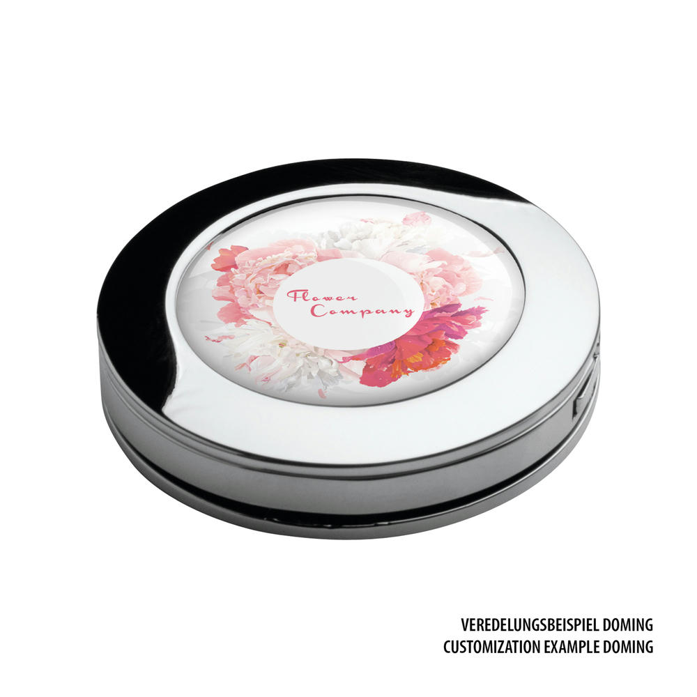 Der silberne Taschenhaken aus Metall hat eine kreisrunde, weiß abgesetzte Veredelungsfläche auf der Vorderseite, die sich für ein ausdruckstarkes Doming anbietet. Zusätzlich wird dem Artikel eine Aluminiumplatte beigefügt, die für eine Veredelung mit Lasergravur genutzt werden kann.