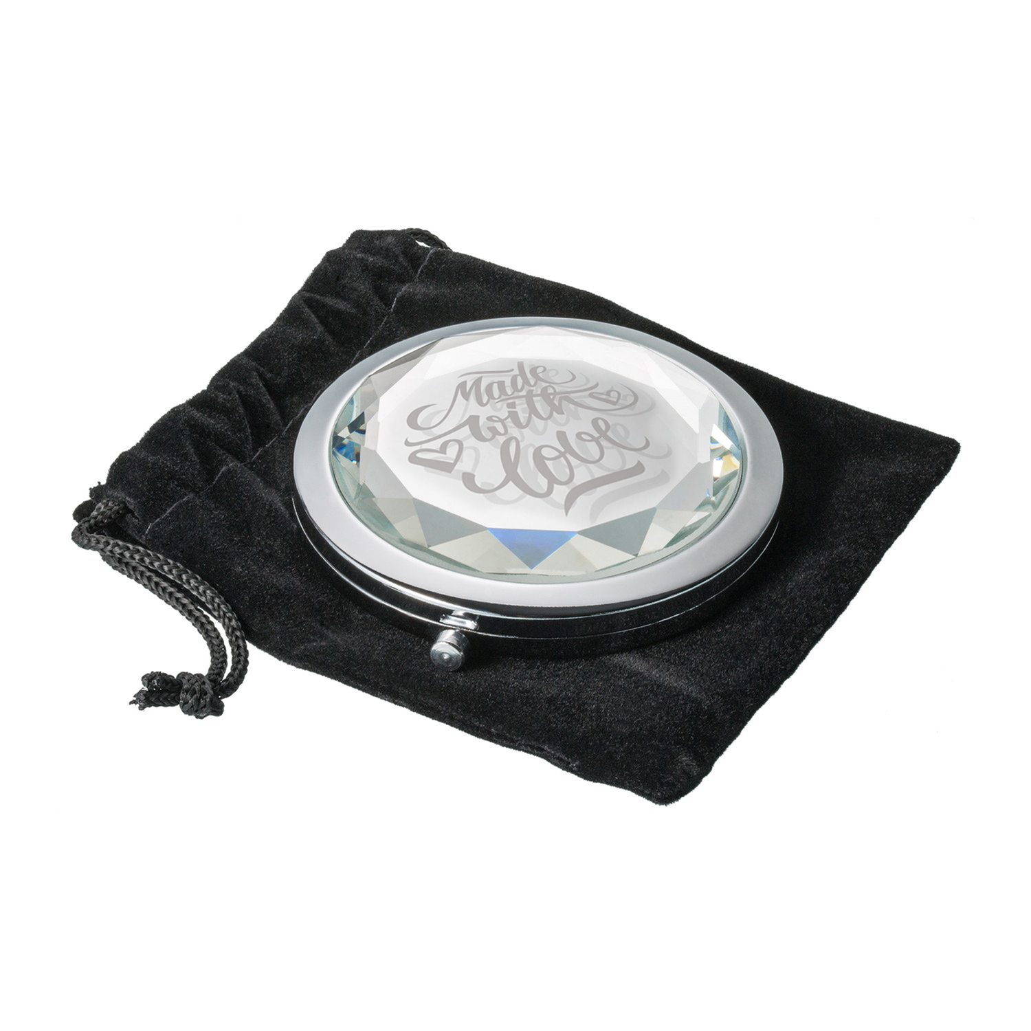 Taschenspiegel mit schmuckvoll geschliffenem Glasdeckel. Die Glasoberfläche kann per Druck mit einem Logo veredelt werden und wirkt durch die Spiegeloptik besonders reizvoll. Lieferung im schützenden Samtsäckchen.