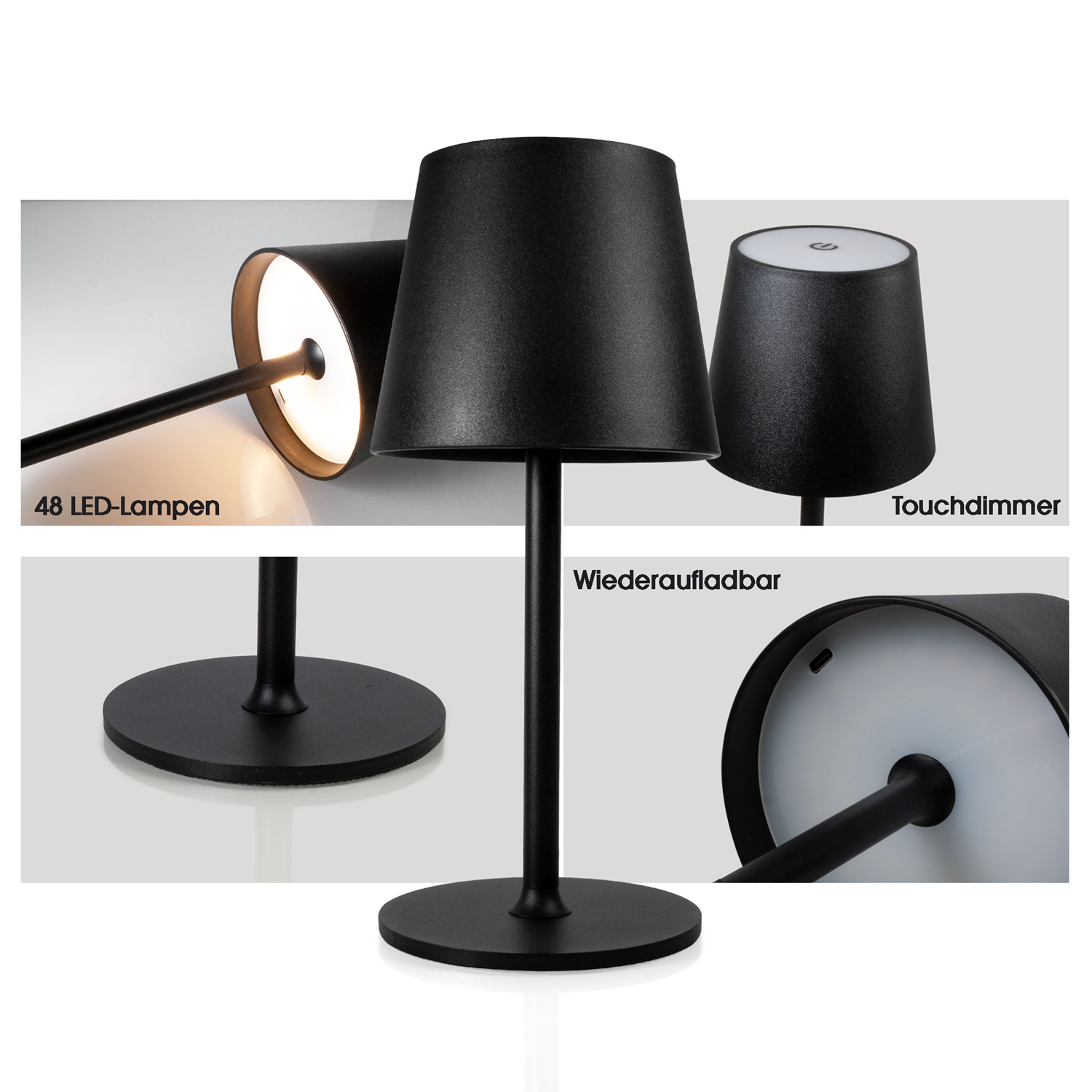 Dimmbare LED-Akku-Tischleuchte für die Terrasse und den Wohnbereich mit einer wählbaren Farbtemperatur von 3000K/4500K/6000K. Ein- und Ausschalten durch Berühren der Touchfläche des Lampenschirms. Die Akkulampe kann mit dem mitgelieferten USB-Kabel aufgeladen werden. Tischbeleuchtung für 12 Stunden bei maximaler Helligkeit und bis zu 24 Stunden bei Dimmung (Li-Ion-Akku, 3.600 mAh).