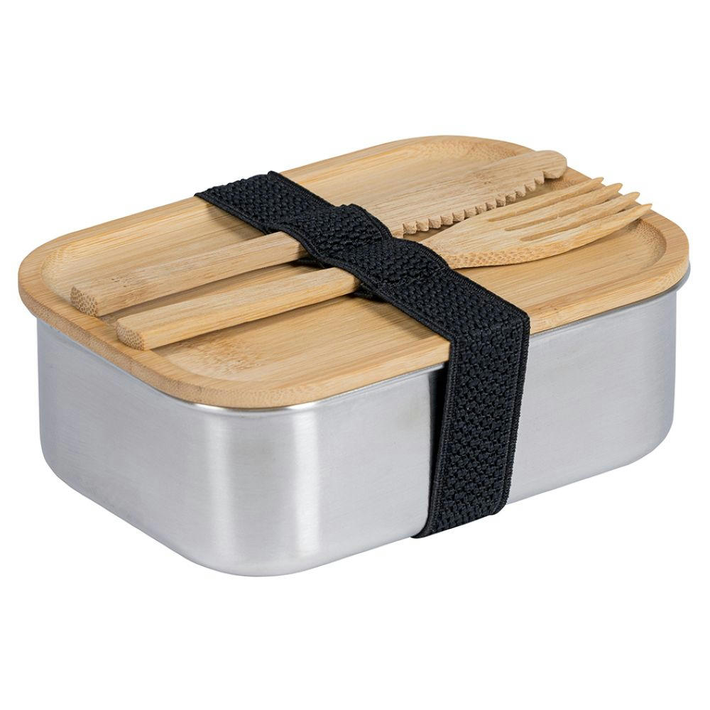 Nachhaltige Lunchbox aus Edelstahl. Deckel, Messer und Gabel aus Bambus. Inkl. schwarzem elastischen Band zum verschließen der Dose. Füllmenge: 1,1L.