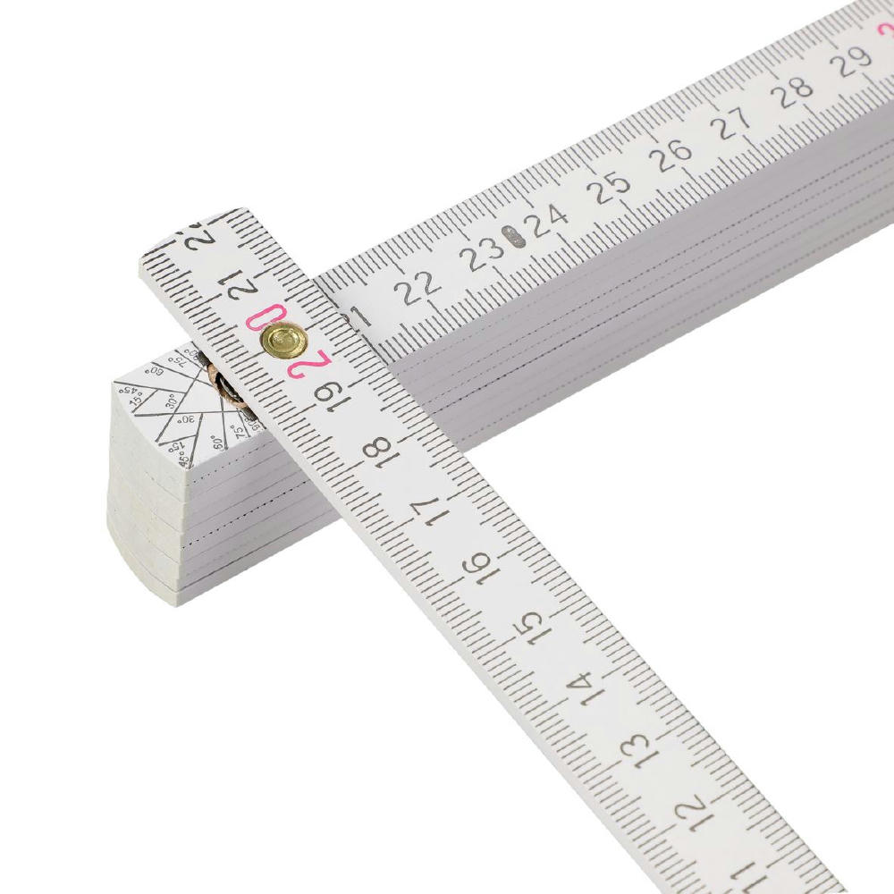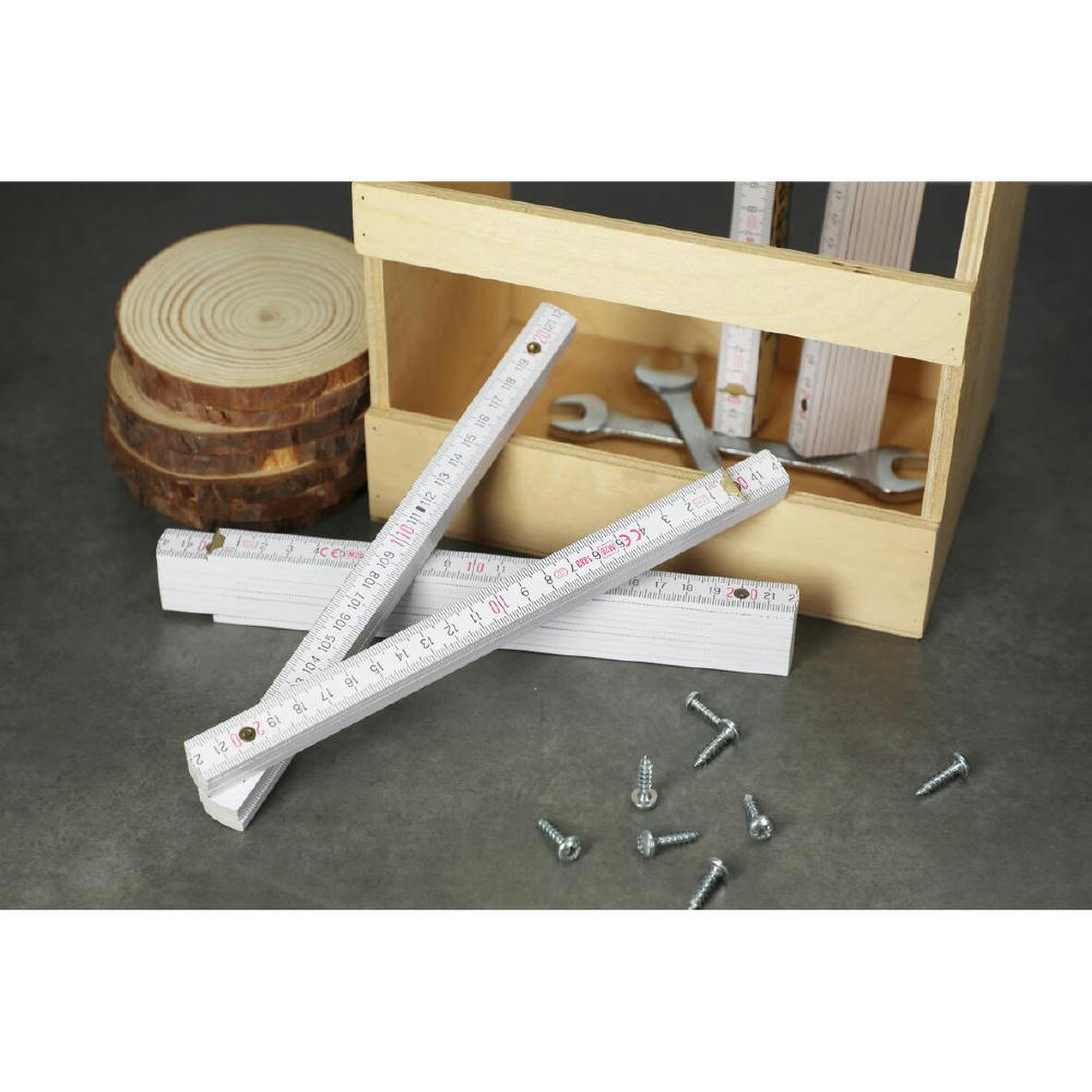 Hochwertiger weißer Glieder-Maßstab aus Buchenholz. Hohe Qualität durch die metallenen Gelenke und die sichtbaren Nieten. Länge: 2 m.