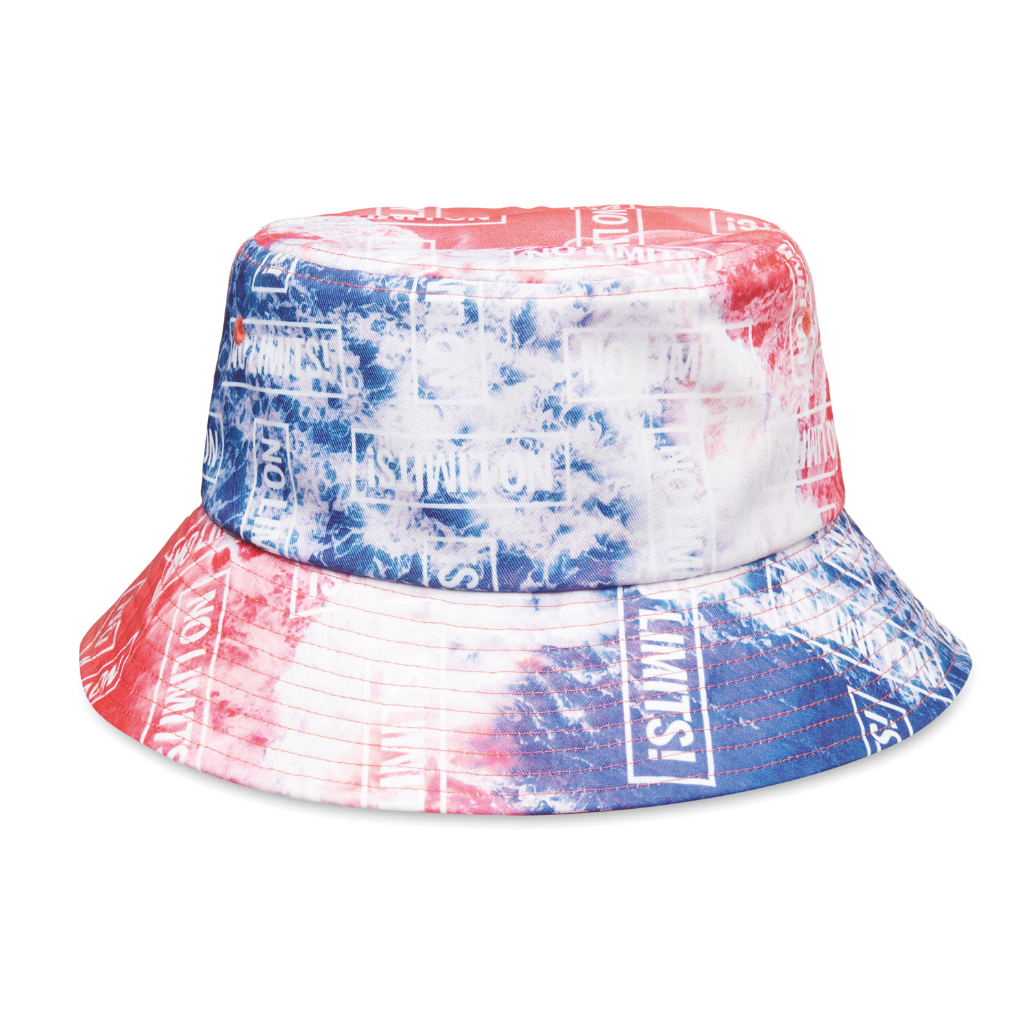 Full Color Bucket Hat aus weißem Polyester. Ihr Design wird auf die Außenseite des Hutes und auf die Innenseite der 5,5 cm oder 7,5 cm breiten Krempe gedruckt.