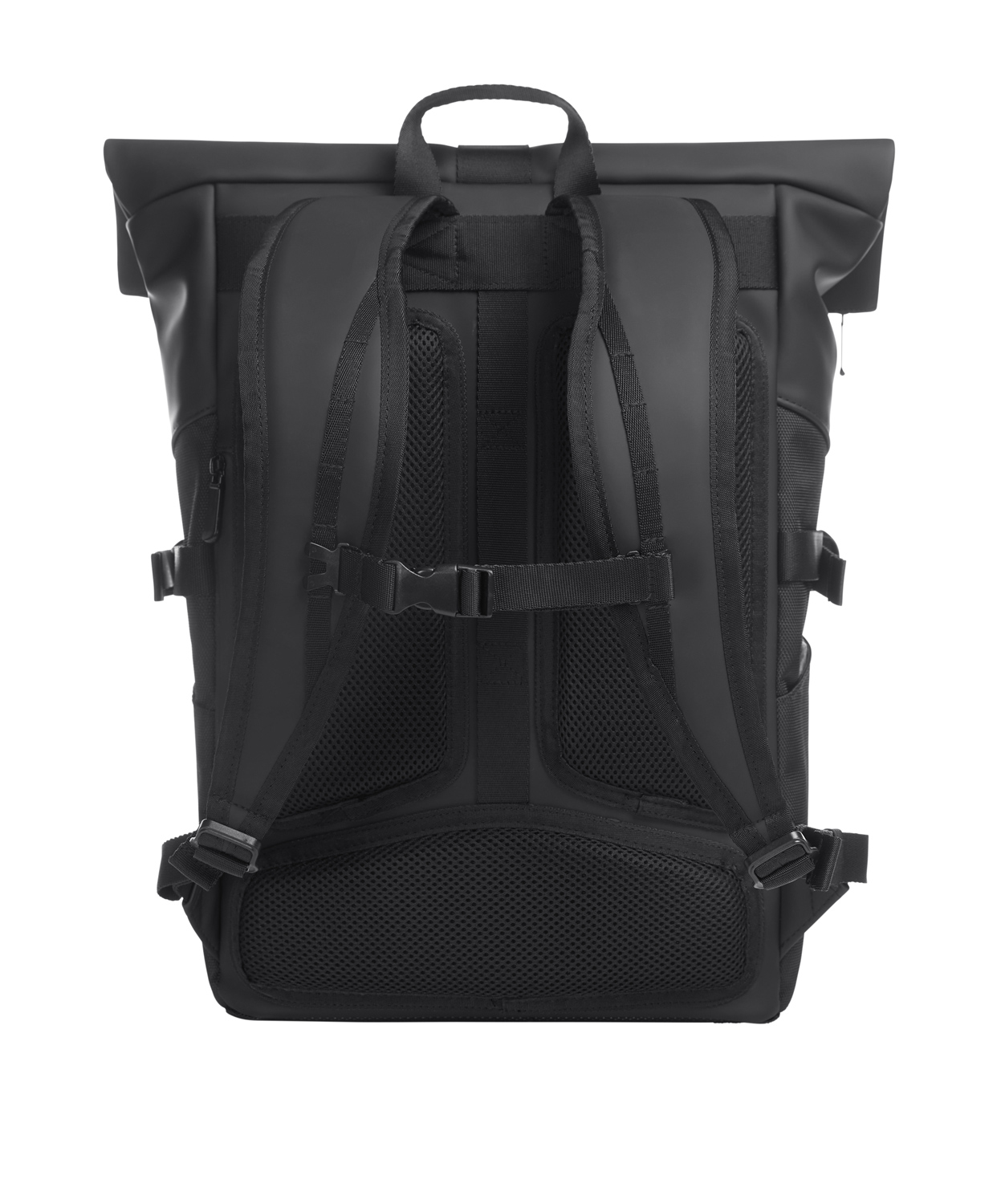 Rolltop-Rucksack; Reißverschluss-Hauptfach mit Steckverschluss; große Reißverschluss-Vortasche; zwei seitliche Einsteckfächer; Fixiergurte; Reflexeinsatz auf der Front; innen gepolstertes Einsteckfach mit Klettsicherung; verstecktes Reißverschluss-Fach rückseitig; gepolstertes Tragesystem mit individuell einstellbarem Brustgurt; Hand- sowie Tragegriff.